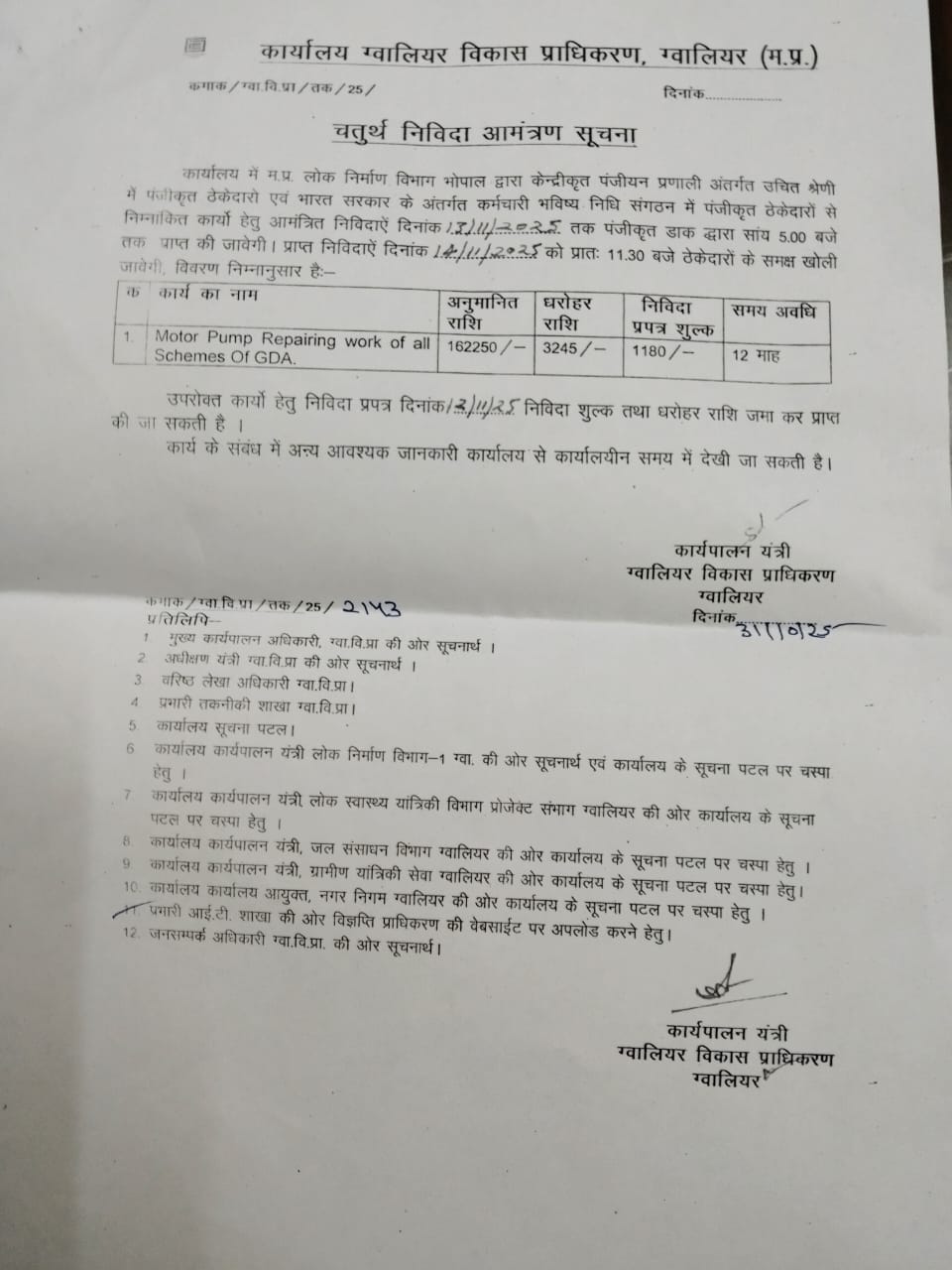ग्वालियर विकास प्राधिकरण में विभिन्न कार्य हेतु निविदा आंमत्रण सूचना